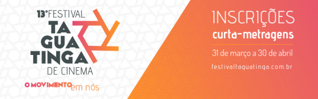 Até 30 de abril, estão abertas as inscrições para a mostra competitiva do 13º Festival Taguatinga de Cinema. Com o tema “O Movimento em nós”, o Festival receberá obras de curta-metragem com até 30 minutos de duração, produzidas entre 2016 e 2018. Podem participar filmes de ficção, documentários, filmes experimentais e de animação. A inscrição é gratuita.